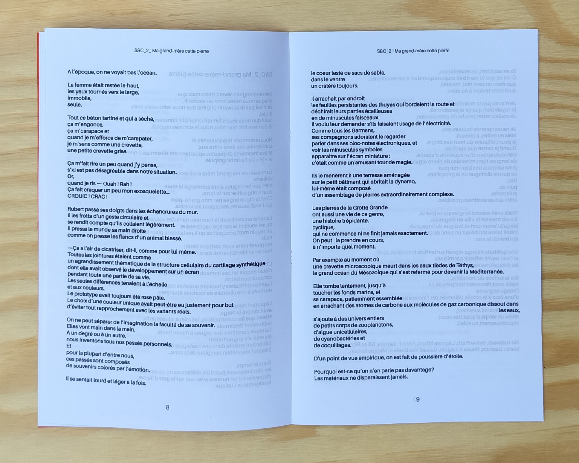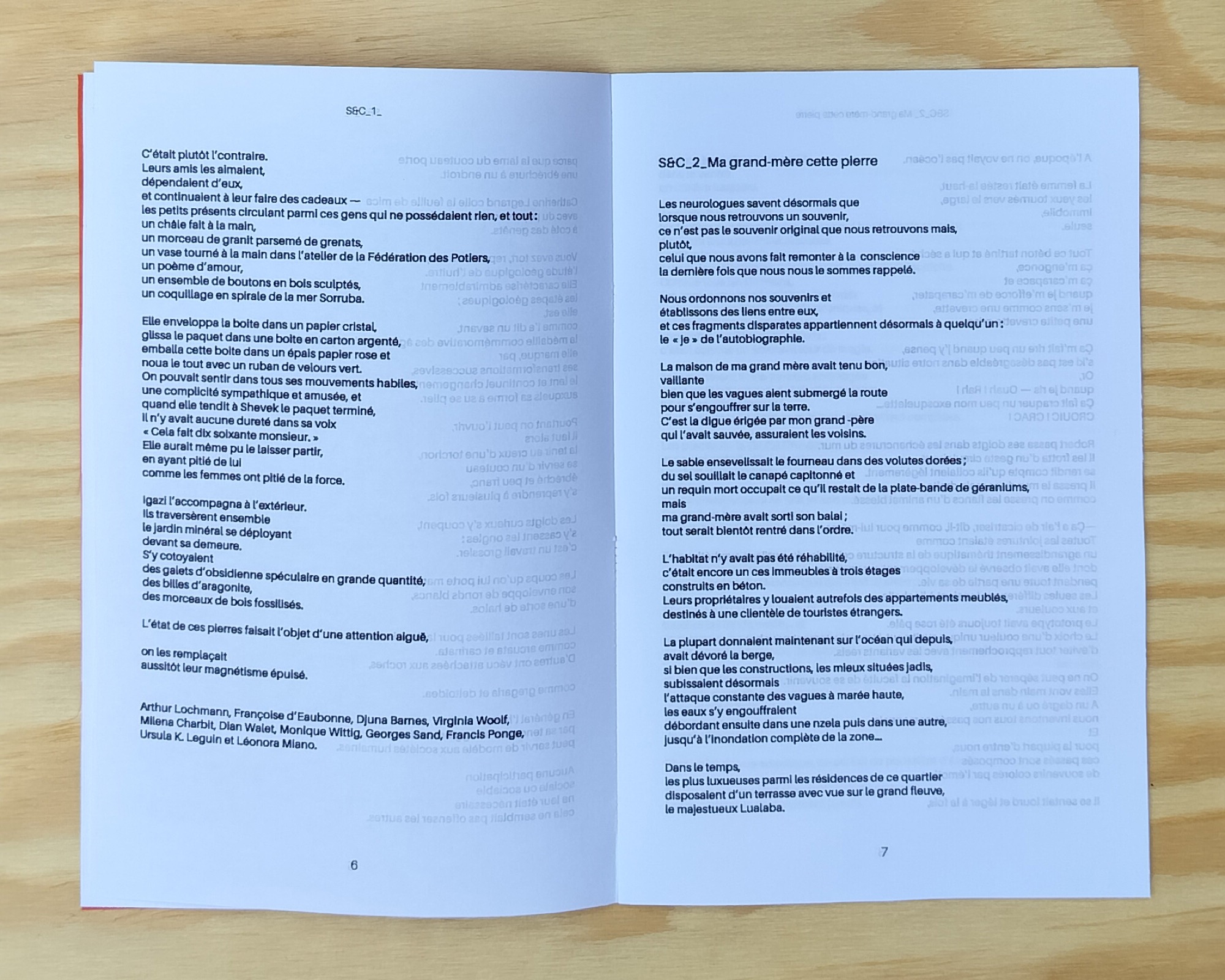 Les textes «CasaCaisse» et «Ma grand-mère cette pierre» ont été publiés en 2024, respectivement dans Le Journal des Laboratoires d’Aubervilliers, en avril et dans la revue Sabir n°7 en decembre.